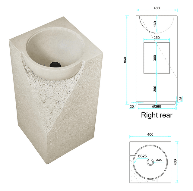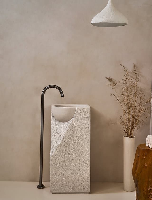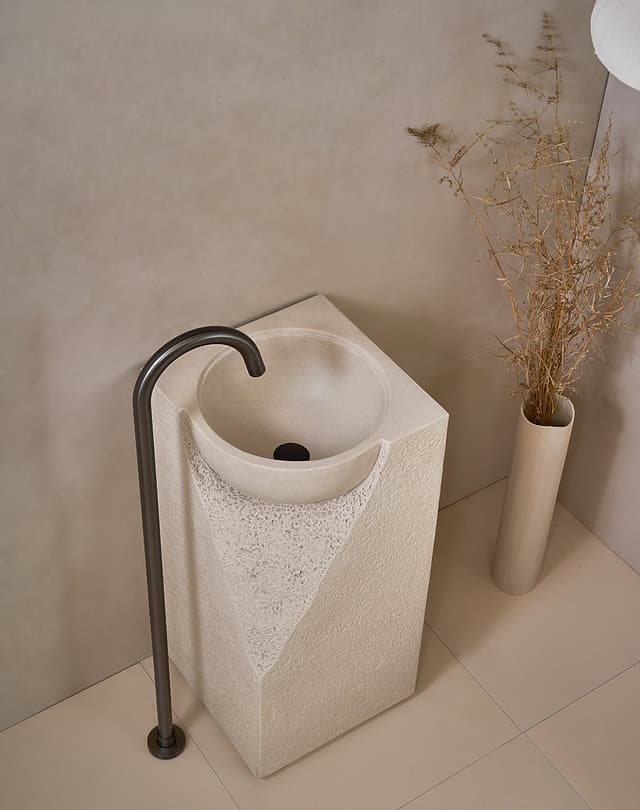 כיור עומד ארטיפיקל זה משלב חומר דמוי אבן בגימור מינרלי בגוונים ניטרליים, עם טקסטורת משולבת של משטח מחוספס ומשטח חלק.