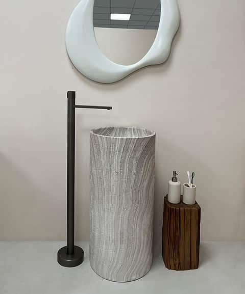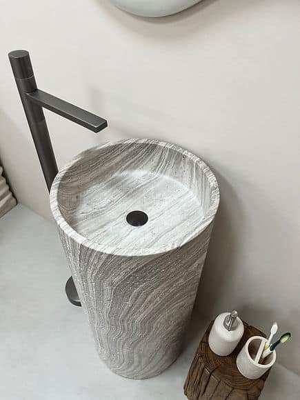 הכיור הזה הוא הרבה מעבר לפריט פונקציונלי – הוא אלמנט עיצובי שמשדרג את כל החלל. עשוי חומר מינרלי סינתטי בגוון בהיר, במרקם מחורץ, היוצר אפקט טבעי ומעודן של שיש גולמי מלוטש בטבע.